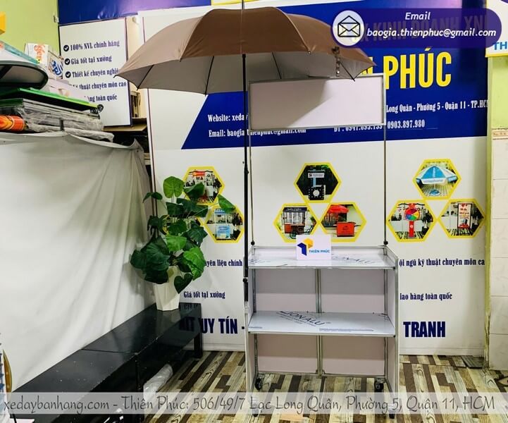 - Thiết kế tiện lợi: có kệ, ngăn chứa, dù chống nắng mưa để bán hàng liên tục.