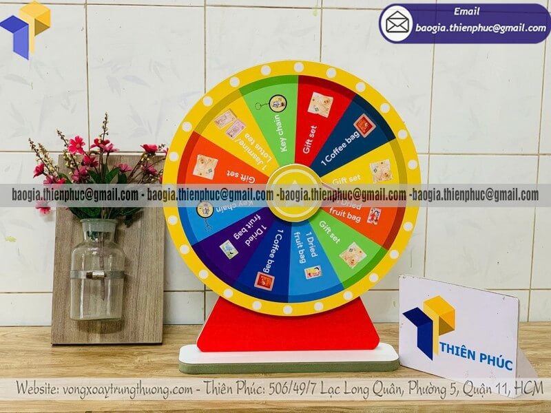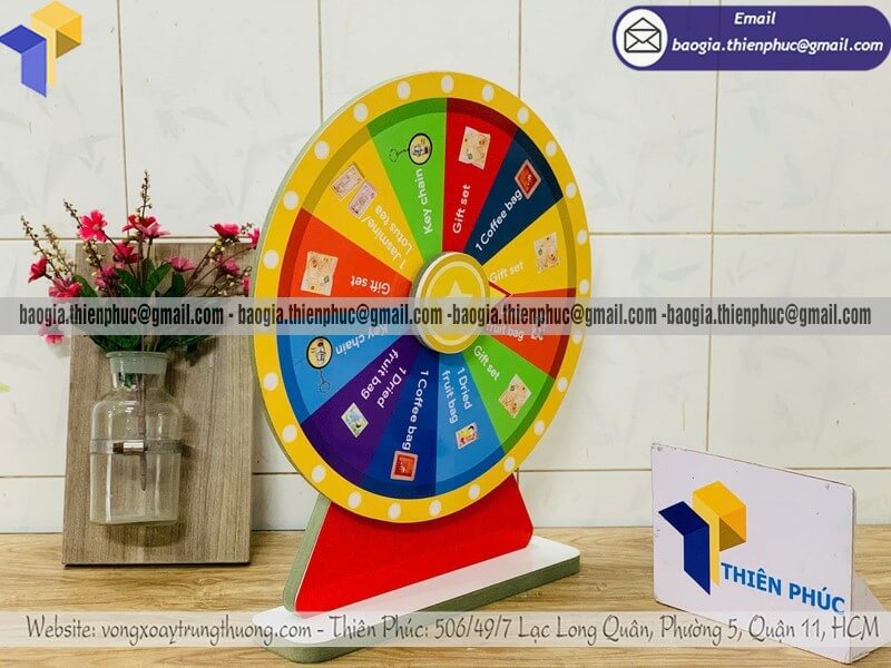 Một chiếc vòng quay may mắn để bàn đặt tại quầy hoặc gian hàng sẽ dễ dàng thu hút người đi ngang qua dừng lại tham gia.