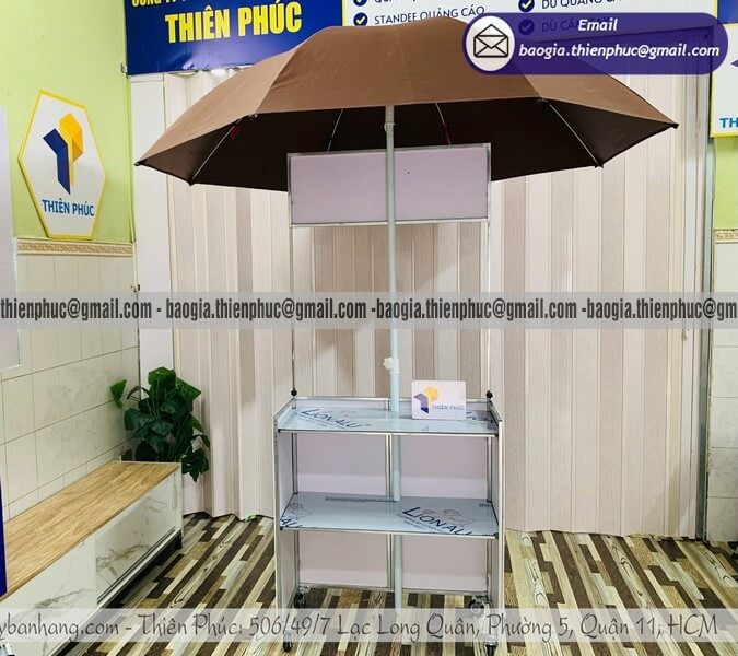 Mẫu quầy này được trang bị dù phía trên giúp che nắng và mưa nhẹ, rất phù hợp với những người bán hàng ngoài trời trong thời gian dài.