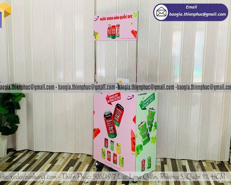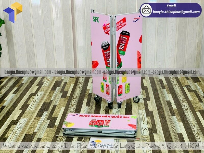 Phần khung và bánh xe được thiết kế bền để dùng lâu dài qua nhiều chiến dịch. Khi thay đổi thông điệp hay ra mắt sản phẩm mới, bạn chỉ cần thay phần mặt in – chi phí thấp hơn nhiều so với làm lại toàn bộ quầy. Đây là lý do nhiều nhãn hàng FMCG lớn đầu tư quầy chất lượng cao ngay từ lần đầu.