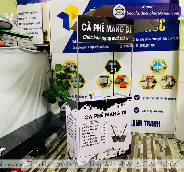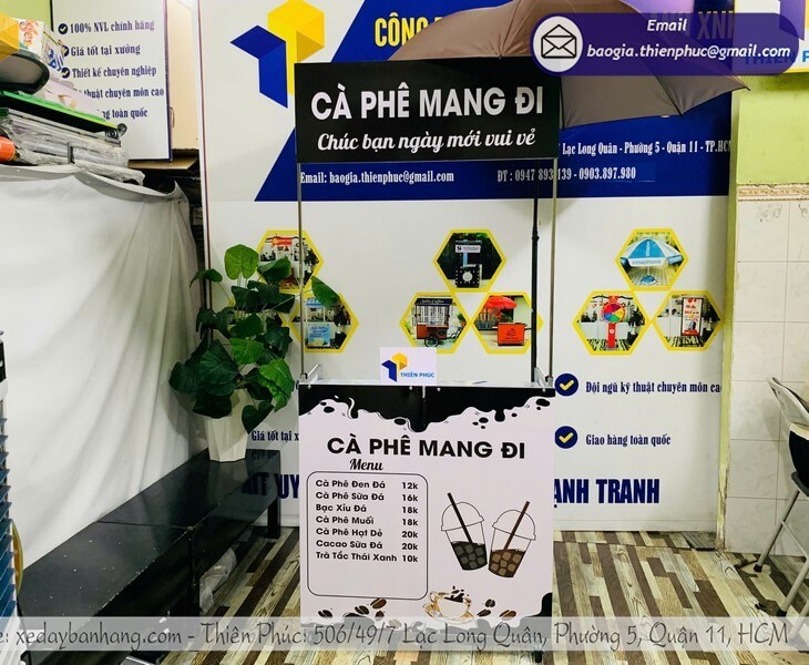 Trong xu hướng kinh doanh di động hiện nay, xe bán cà phê take away đang trở thành lựa chọn hàng đầu cho những ai muốn khởi nghiệp nhanh, tiết kiệm chi phí nhưng vẫn thu hút khách hàng. Với thiết kế gọn nhẹ, tiện lợi, xe được trang bị dù chống nắng mưa, giúp bạn bán cà phê mọi lúc, mọi nơi mà không bị ảnh hưởng bởi thời tiết.