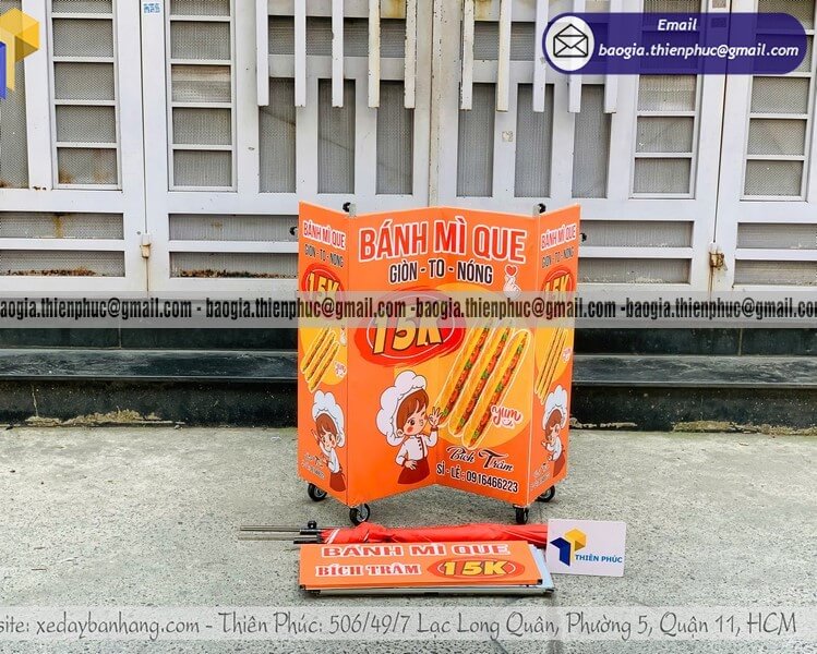 Liên hệ đặt hàng ngay để được tư vấn và gia công xe bán bánh mì que di động gấp gọn, sẵn sàng bán ngoài trời.