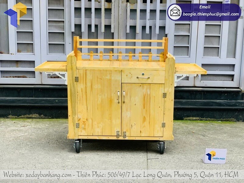 Xe được phủ lớp sơn chống thấm và chống mối mọt, có bánh xe xoay linh hoạt giúp di chuyển nhẹ nhàng. Dù bán ở ngoài trời hay trong nhà, xe cafe gỗ vẫn giữ được độ bền, không cong vênh hay bong tróc.